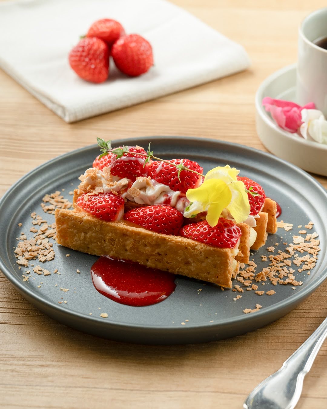 ワッフルにレモンチーズホイップを重ね、さくらホイップと苺をトッピング。ほんのりさくらが香るストロベリーソース、さくらアイス、ホワイトチョコとメレンゲのグラノーラとともに。