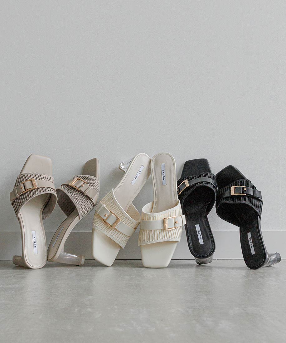 フロントに施したベルトデザインが印象的なミュールサンダル。涼しげなクリアヒールでシーズンムード高まる一足です。