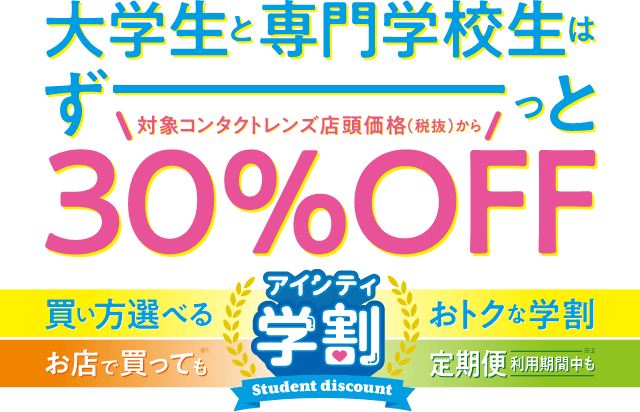 アイシティでは学生証を店頭でご提示いただくと使い捨てレンズ、ハード・ソフトレンズが
