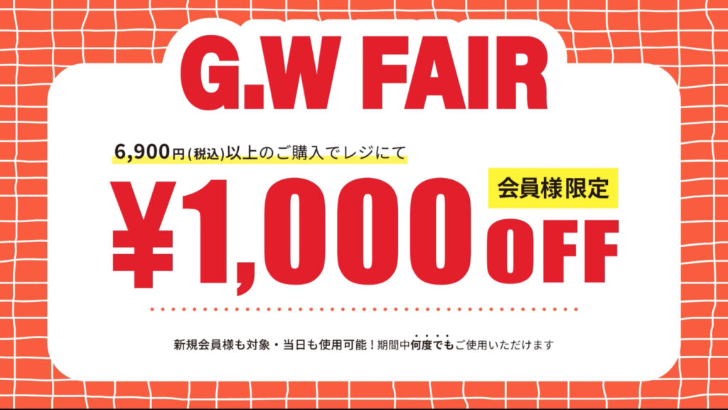 1会計6,900円(税込)以上お買い上げで、当日から使用できる1,000円オフとなります。
